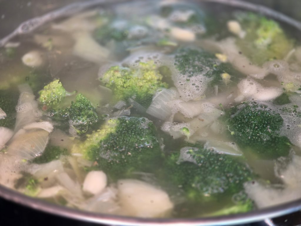 Do schëdden ech dann d’Waasser drop, driien Hëtzt rop an loossen Zopp opkooschen. Dann driien ech d’Hëtzt raaf an loossen Zopp su lang kooschen bis d’Gromperen an de Broccoli mëll ass. Schmaaschen an würzen meng Zopp.