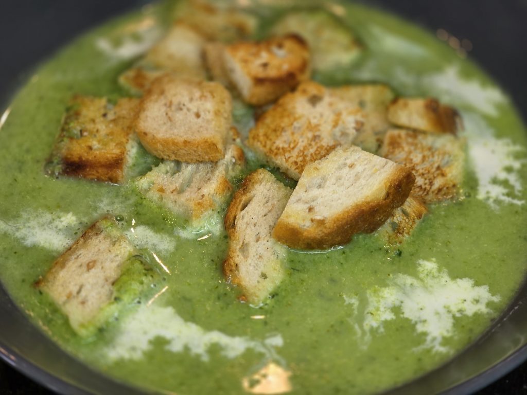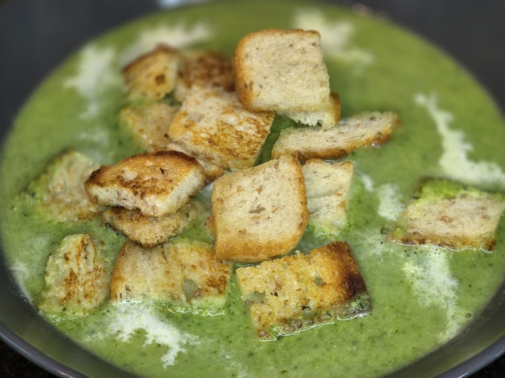 Kooscht een dës Zopp kann een sech ruhig deen Moment gönnen. Eent Steck Brugd an bëssen Olivenualig réisteren, villäicht sugar mat enger opgeschniddener Ziif Knuawelek angeriwen. Paar van dësen würzigen Croûtons op der Zopp verdeelen. Datt brengt Textur.