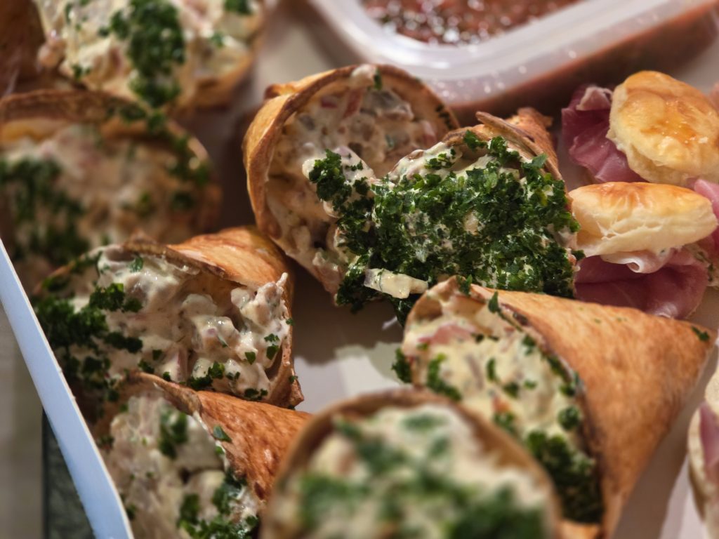 Besonnig spannend fannen ech dës Tortilla-Zylinderen. Sie sen eent schingt Beispill fir die modern Fingerfood-Entweckelung. Bekanntes nei gedeit. Den Tortilla jiët halbéiert an, an Zylindere geformt, déi jiän mat engem Zanhstocher fixéiert, mat Ei angepinselt an am Schiäffchien knupserig gebaaschen. Die Cremig Pouletfëllung ass bewosst mëll gehaalen. Frëschkiss mat Mayonnaise, fein gehacktem Spitzpaprika an Péitersilich suarigen fir Kontrast. De Péitersilich brengt net nëmmen Faaref, mee o flüchtig Aromen, déi mir viraan allem mat der Naass ophualen. De Spitzpaprika liwert Séissheet an Frëscheet, ouni dominant ze sen. Datt alles zesaammen erjiëtt datt perfekt Mondgeféihl, an genau datt ass een van de Grënn firwatt Fingerfood su goud fonktionéiert.
