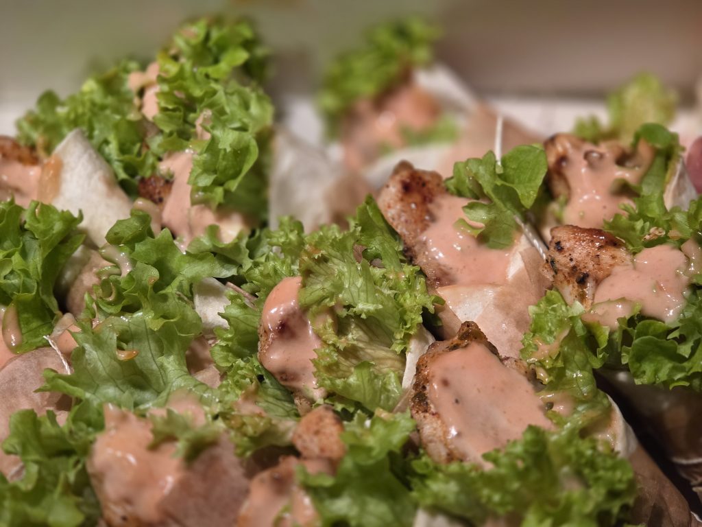Mini-Wraps mat Poulet, engem Blaad Zaloot an als Zooss han ech einfasch Mayonnaise an Ketchup gemëscht. De Wrap ass deen moderne Cousin vam Fladenbrugd. En ass flexibel, neutral am Goût an domatt die perfekt Bühn fir kräftig Fëllungen. Deen gebroodene Poulet, deen ech firtischt mat Salz, Päffer, Paprikapolwer, Oregano an bëssen Olivenualig marinéiert han, brengt Röstaromen an Proteinen. D’Zooss brengt eng Balance aus Sauer, Séiss an Fett. Den Zaloot brengt Frëscheet. Studien weisen, datt Ässen mat enger gouder Balance aus Fett, Salz an Säier als besonnig befrigdigend wiriken, sie aktivéiren eist Beloungsystem besser wie einfasch monoton Aromen.