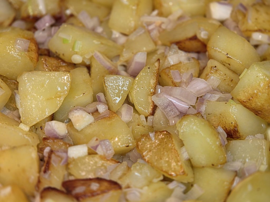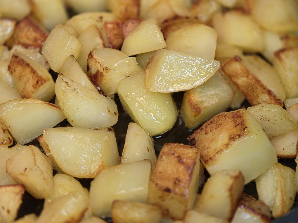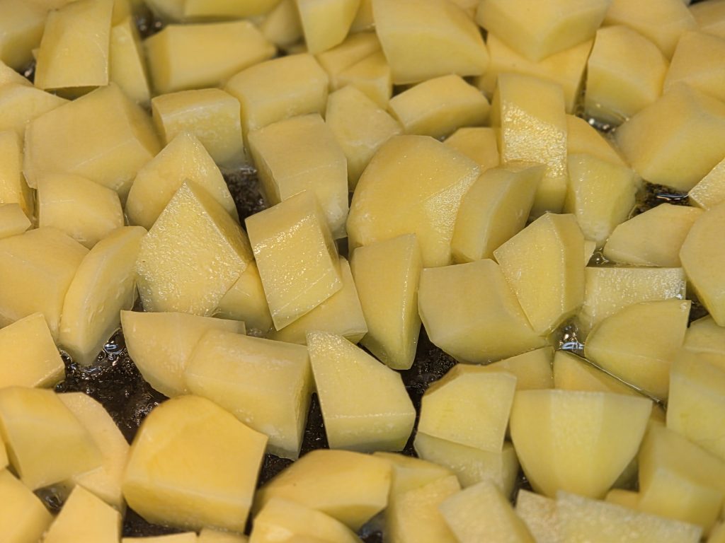 • Gromperen schiälen ech an schnegden se an Würfel oder an Scheiwen, net ze deck. Déi wäschen ech eng kéier grëndlich aaf an tuppen se dann mat Këchenpapeier liit drëchen.