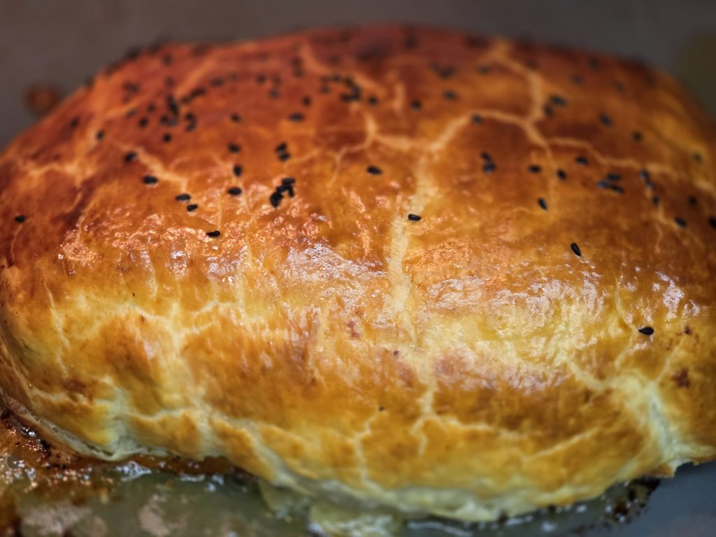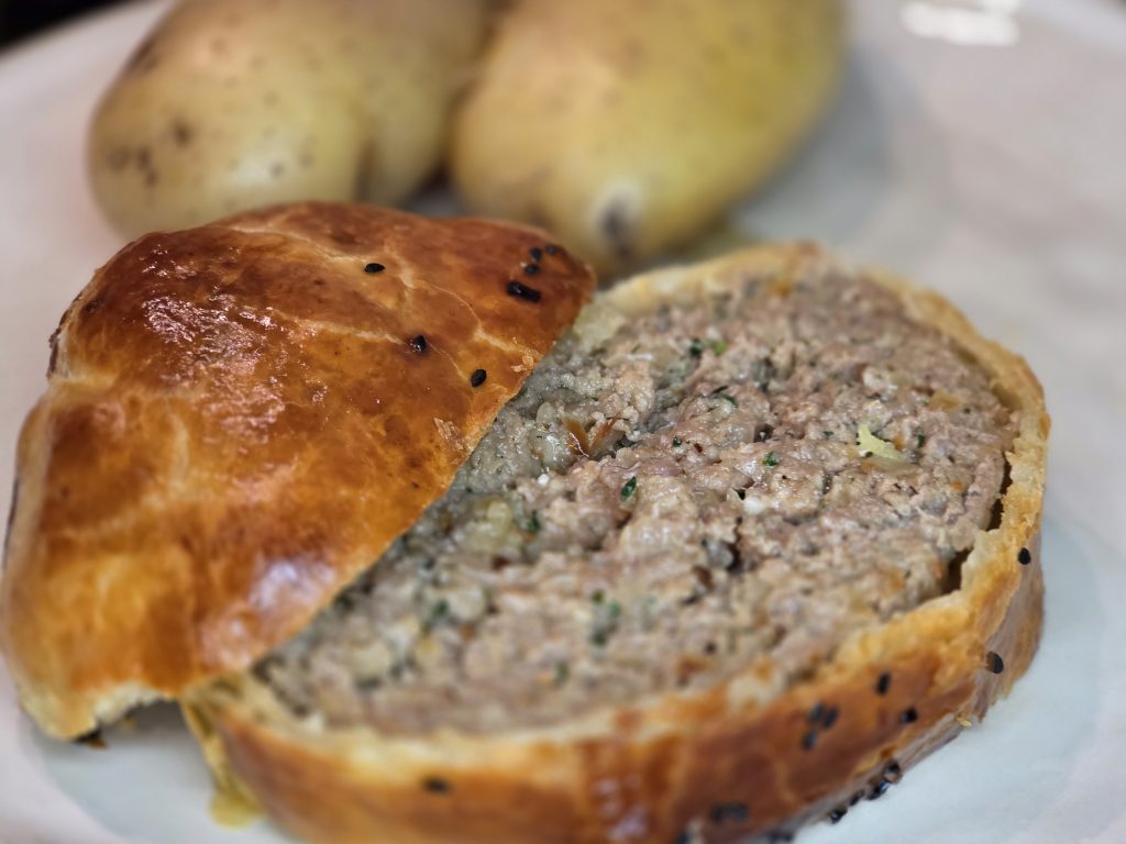 De Bläderdeeg ass rischt mi spéit dobäi kommen. Fransiischen Anfloss, die ländlich Këchen, den Wonsch no jiät mi „Feinem“. An su ass aus dem Gehacktesbroot jiät jiän, datt een o Sonndes op den Dësch setzen konnt, an datt, ouni sech ze entschëlligen. Den Deeg hat 2 Aufgaben iwerhollt: de Gehacktesbroot ass net verdrëchent an den Ënnerscheed an den Texturen. Baussen knusperig, bannen saaftig, simpel, äwer effektiv.