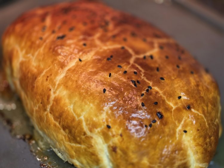 Dësen Broot leen ech dann op eent mat Baaschpapeier ausgeleiten Blech an pinselen mat engem opgeschloenen Ei an. Hei kanns du lo na Sesam, Kümmel oder wie ech Schwarzkümmel driwer streien. Su setzen ech den Broot dann fir ongeféier 35 Min. an deen waarmen Schiäffchien.
