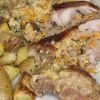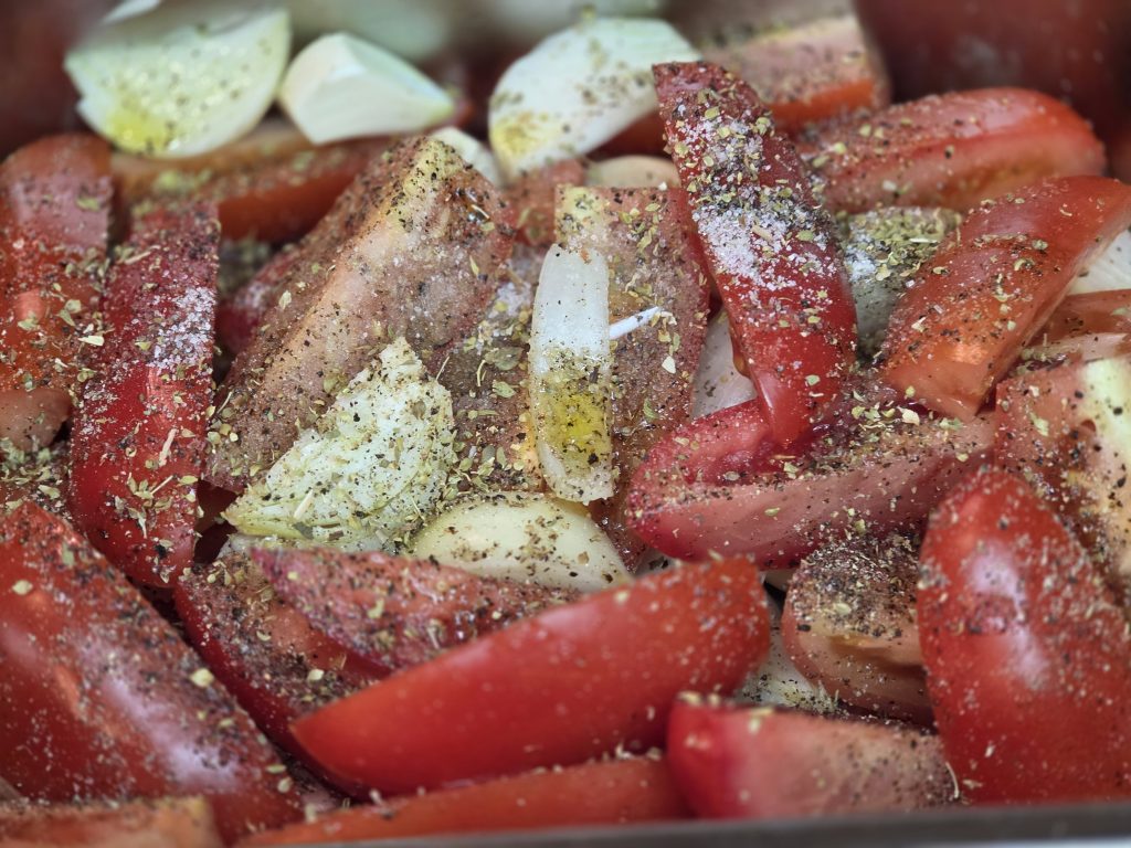 Bëssen mi spéit haat ech Tomaten grëndlich gewäsch, an aaschtel geschnidden an op eent Baaschblech verdeelt. Dozwëschen han ech ebenfalls an aaschtel geschnidden Ënnen verdeelt. Natiirlich duaref de Knuawelek net fehlen. Iwert datt Ganzt han ech dann Olivenualig verdeelt an gewürzt han ech mat Salz, Päffer an fir deen mediterranen Touch mat Oregano.