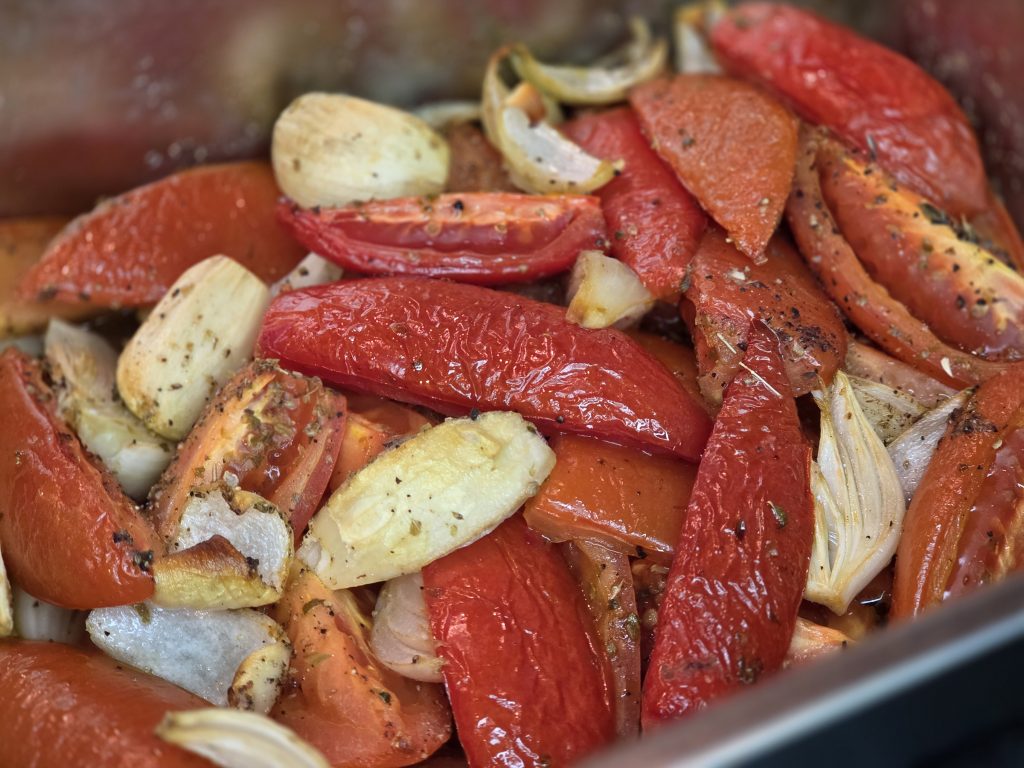 - Tomaten, d’Ënnen an de Knuawelek verdeelen ech op eent Baaschblech an würzen mat Salz, Päffer an Oregano, do driwer verdeelen ech bëssen Olivenualig