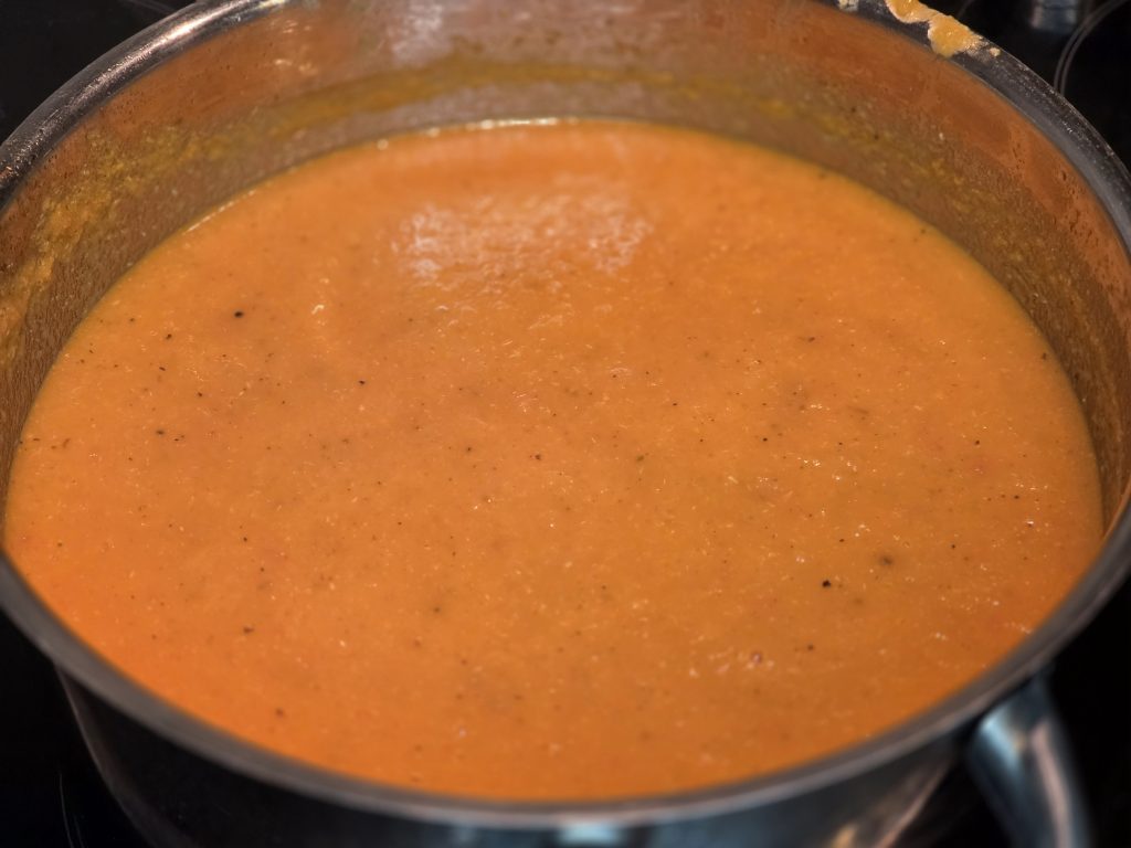 D’Ergebnis ass eng déifrugt, blänkig, sämig Zopp, voll Aroma, an ouni een Hauch Orange oder Rosa, deen dachs d’Ergbenis vam Stabmixer ass. Et miärikt een et besonnig bei San Marzano Tomaten, sie han well mi eng kräftig Faaref an d’Passe Vite brengt dës Faaref na besser zur Geltung.