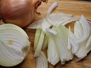 - An der selwischter Pann brooden op mëttel Hëtzt d’Ënnen, ech lossen mir dofir Zekt, sie sollen gemellig karameliséiren an su hiren vollen Goût entweckelen.