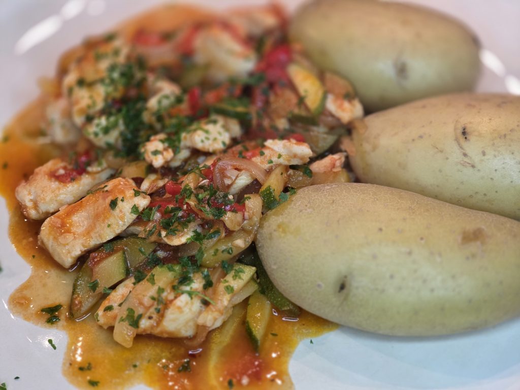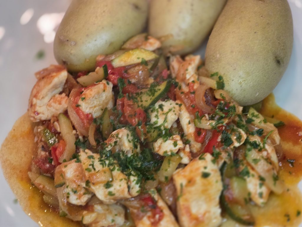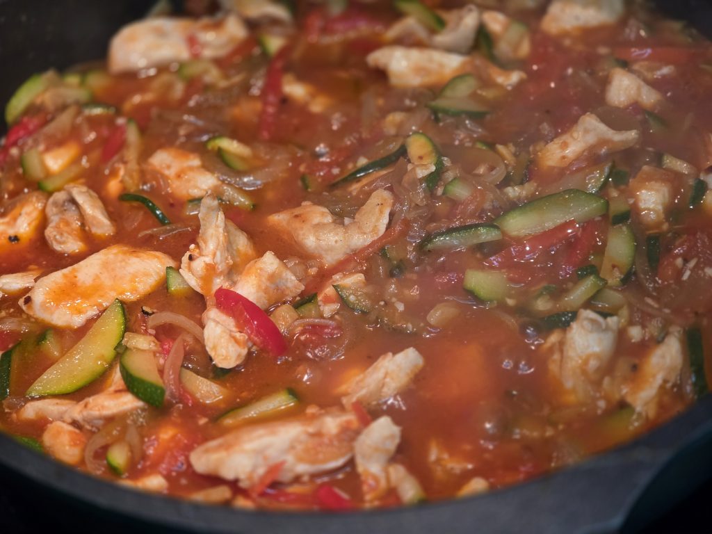 Ech selwer han an mengem Rezept Pouletfilet gehollt, zaart moojer, siier gegaart an wonnerbar geegent, fir de Goût vam Knuawelek, Paprika an den Tomaten opzehualen. Poulet ass wahrscheinlich datt internationalst Fleesch iwerhaupt. Houhner sen well an der Antik domestizéiert jiän, an ass bis hokt eent van deen am meesten konsuméierten Fleeschzorten. Et fonktionéiert äwer o mat anneren Zorten. Schwengsfilet brengt mi Würzigkeet, Pute bleift saaftig an mëll, an fir all déi et jiären vegetarisch oder vegan wëllen, entweckelt Reechertofu oder Seitan een ähnlich herzhaften Effekt.