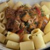 - Als nächst schëdden ech Tomatenzooss drop an mëschen d’Fleesch rem drënner. Datt erhëtzen ech dann fir paar Min. su datt d’Fleesch durich zéien kann an Zooss liit reduzéiert an andëchst. Schmaaschen an würzen evtl. na no.