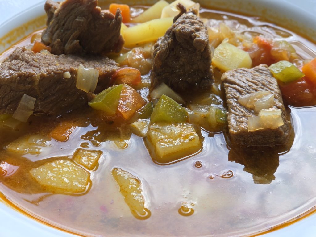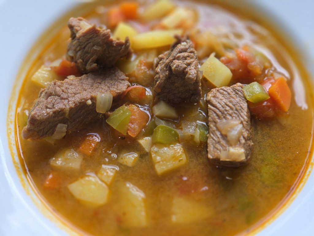 Datt einfascht Hirtenässen hat su een neien Goût krii. Paprika brengt Faaref, Wiäremt an eng mëll Schiäreft. Et harmonéiert perfekt mat den séiss geréisterten Ënnen an deem kräftigen Randfleesch. Aus enger einfascher Fleeschzopp ass su eent Ässen mat Charakter jiän.