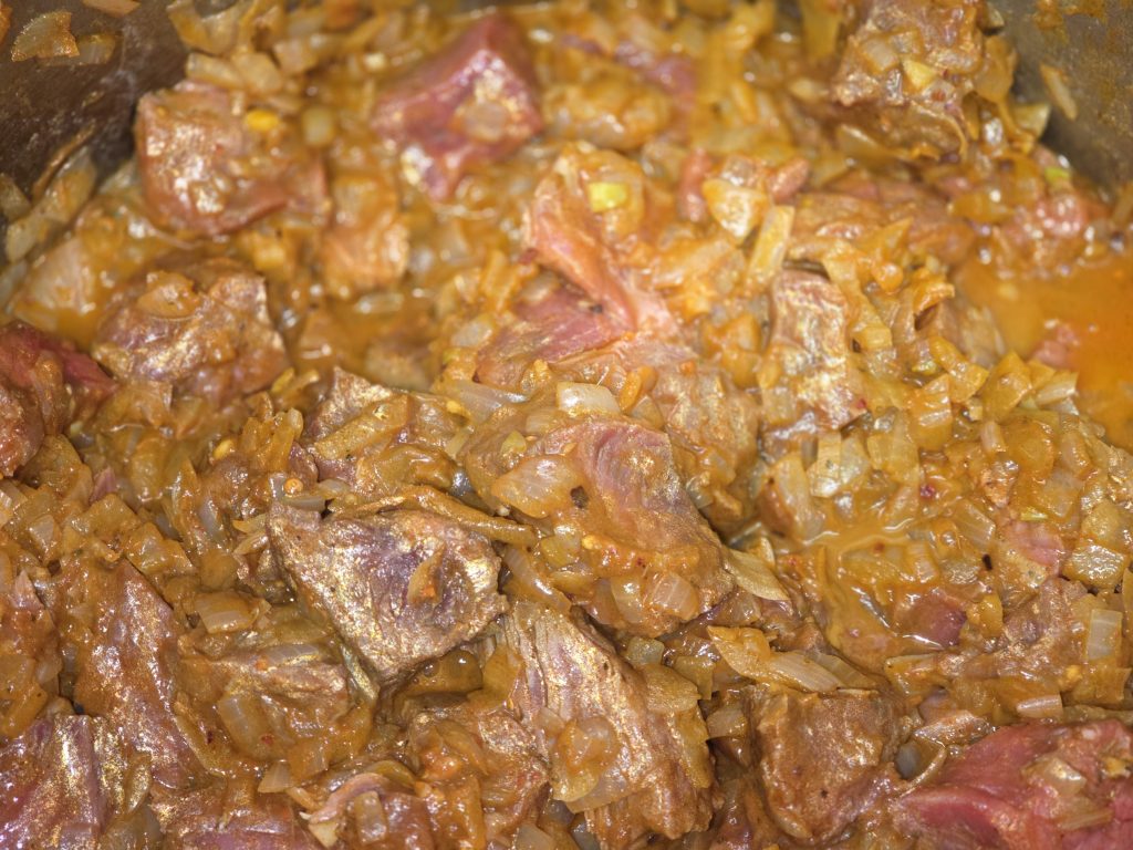 Als nächst mëschen ech d’Fleesch drënner. Datt loossen ech bei mëttel Hëtzt schmoren.