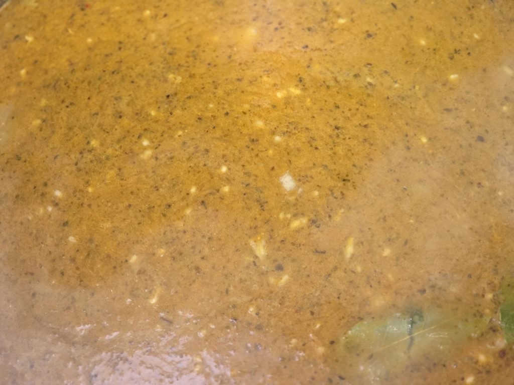 - Als nächst mëschen ech d’Fleesch drënner an loossen datt schmooren, et soll Waasser zéihen an fir paar Min. am eegene Saaft schmooren. Dann schëdden ech d’Waasser drop, loosen Zopp eng kéier opkooschen, driien d’Hëtzt dann raaf an loossen se gemellig fir ongéier 1 Stonn kooschen.