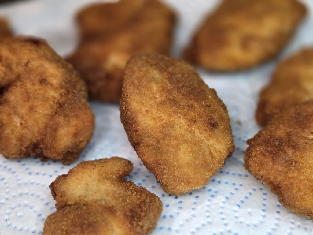 Ass d’Fett waarem leen ech Nuggets dran, hei natiirlich oppassen datts du d’Pann net ze voll mëchs, wann et der vill sen am Besten an Etappen brooden. Su lossen ech se ongeféier 3-4 Min. van all Segt brooden, ech beweegen se iwerhaupt net an der Pann, durich liit schwenken suarigen ech just dofir, datt se net am Buadem aanpëchen. Dann jiän se gedrigt an fiärdig gebrooden. Op Këchenpapeier lossen ech se dann aafdrëpsen.