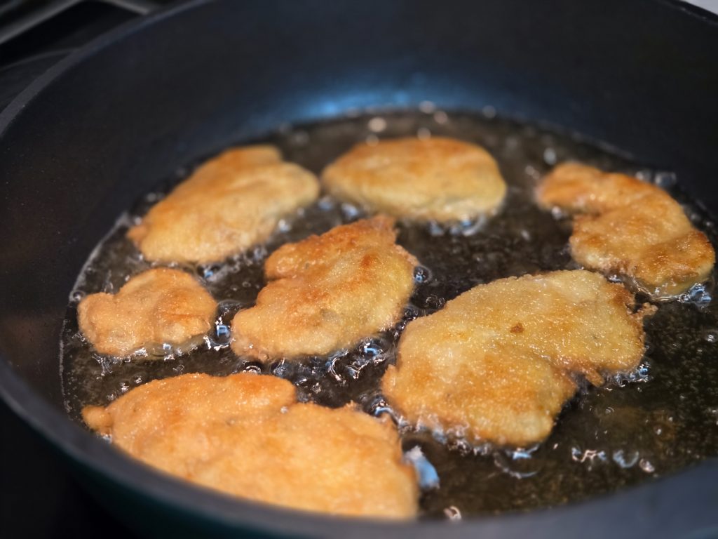 - An enger waarmer Pann erhëtzen ech op mëttel bis hii Hëtzt vill (2cm hii) Randsfett. Do dran brooden ech d’Nuggets dann fir 3-4 Min. van all Segt.