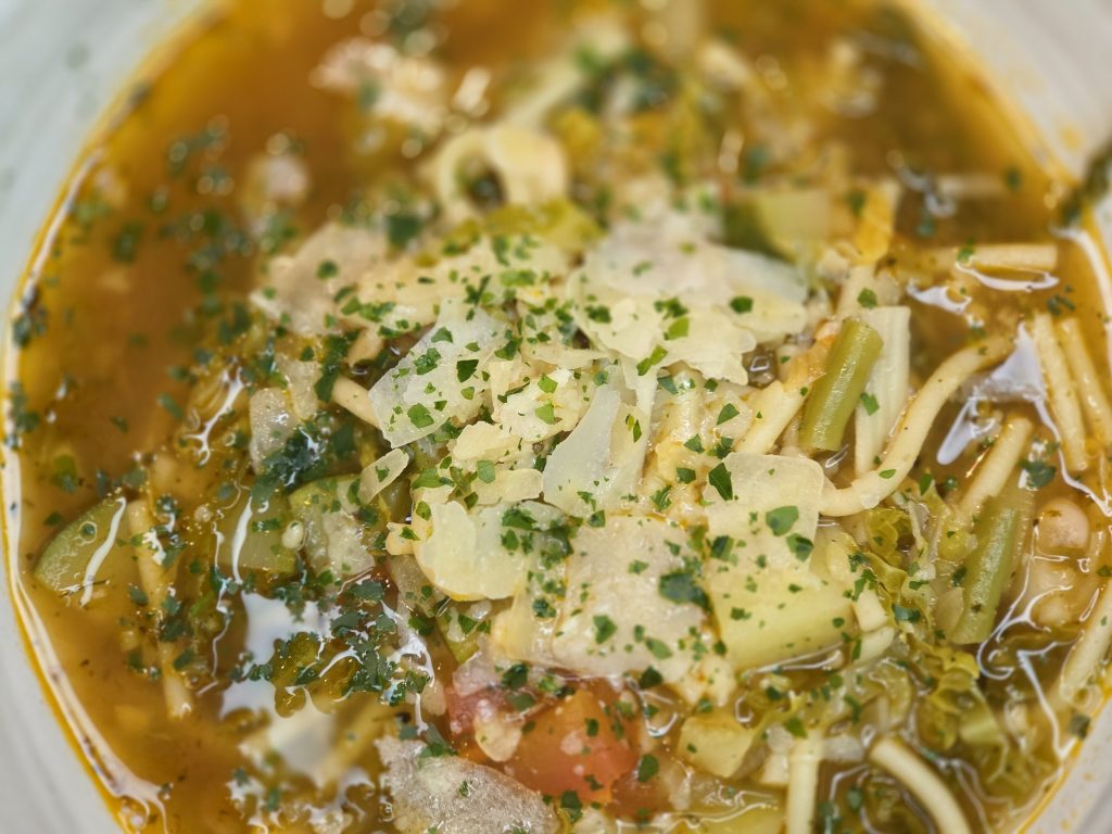 Watt hokt romantisch klengt, wor deemools ganz einfasch Nugdwendigkeet. Minestrone ass entstannen aus Sparsamkeet an Intuitioun. Et ass net no Rezept gekooscht jiän, mee no Joerszekt. Am Fréihjoer wor datt zaart Geméiss, am Summer Courgetten an Kregder, am Hiärest Bungen an Kürbis, am Wanter Kappes an Wuurzelgeméiss. Dës Logik zéiht sech bis hokt durich dëst Ässen.