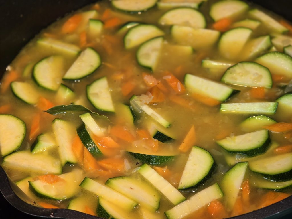 - Noodems et gekooscht hat, mëschen ech d’Courgetten drënner an ech leen die ganz Gewürzer an Kregder dran.