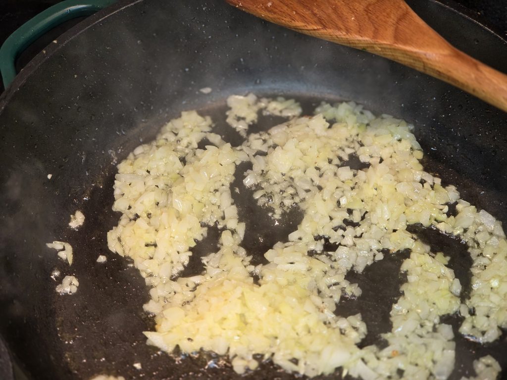 - An der selwischter Pann erhëtzen ech wann nigdig na bëssen Botterschmalz an booden do dran op mëttel Hëtzt d’Ënnen, bis se mëll se, äwer ouni datt se Faaref kreien.