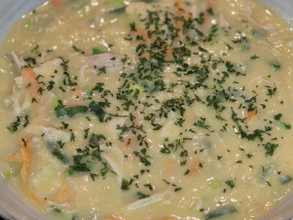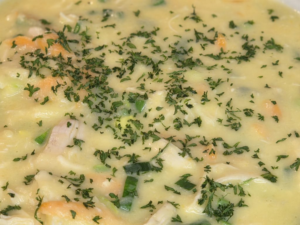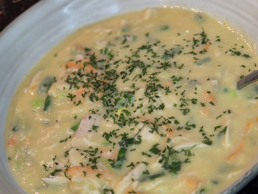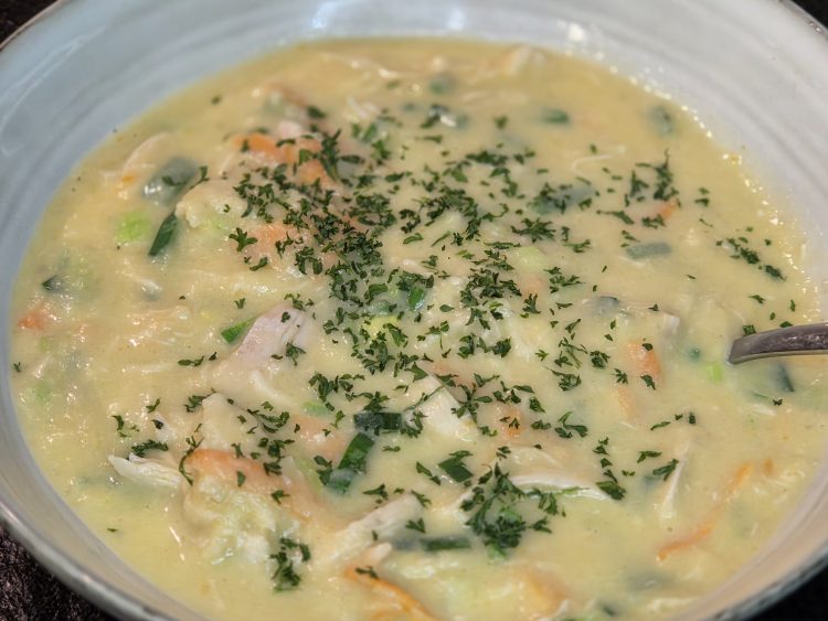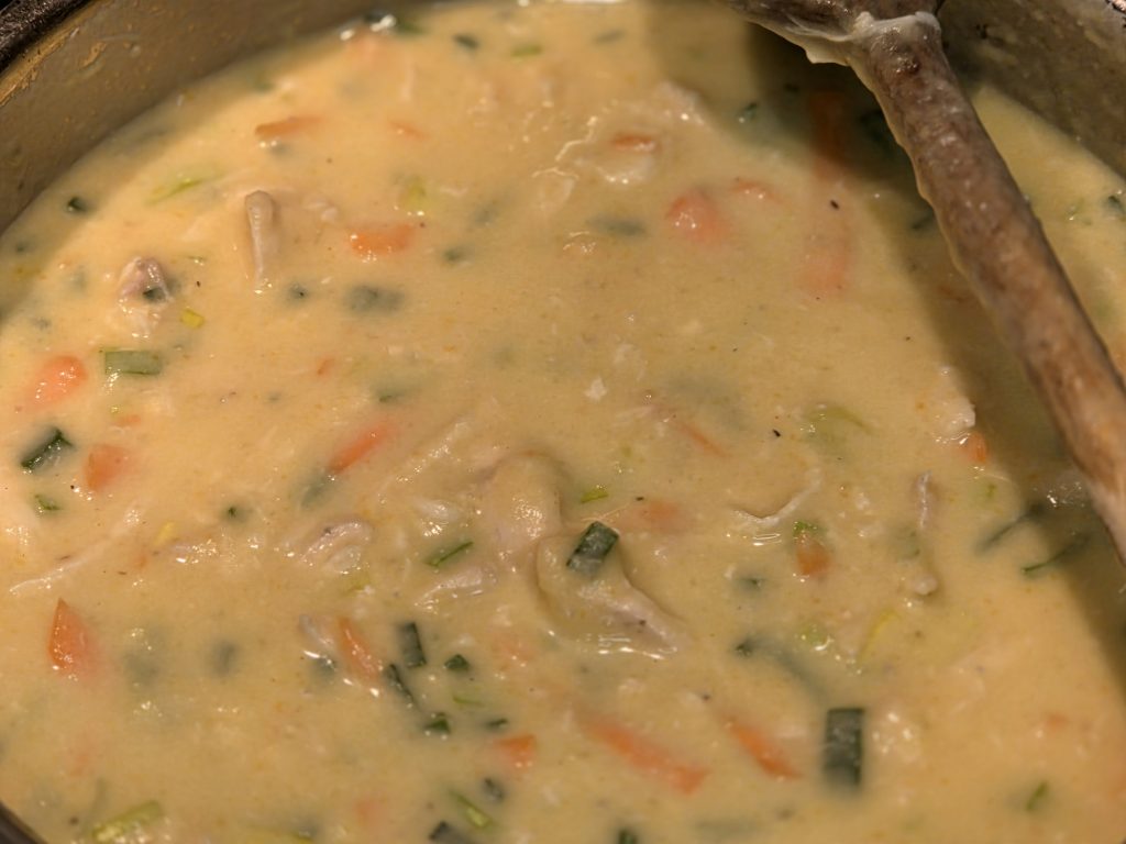 Et se Varianten opgetaucht mat Poulet, firtischt fir d’Rester vam Sonndesbroot ze verschaffen. Mi spéit, ganz bewosst ergänzt, well d’Textur wonnerbar mat der crèmiger Zopp harmonéiert.