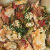 - An engem waarmen Dëppen erhëtzen ech op mëttel Hëtzt de Botterschmalz, do dran dënsten ech datt Ganzt Geméiss, ausser d’Gromperen fir goud 10 Min. aan. Würzen mat Salz, Päffer, Thymian an leen de Lorbeer mat dran.
