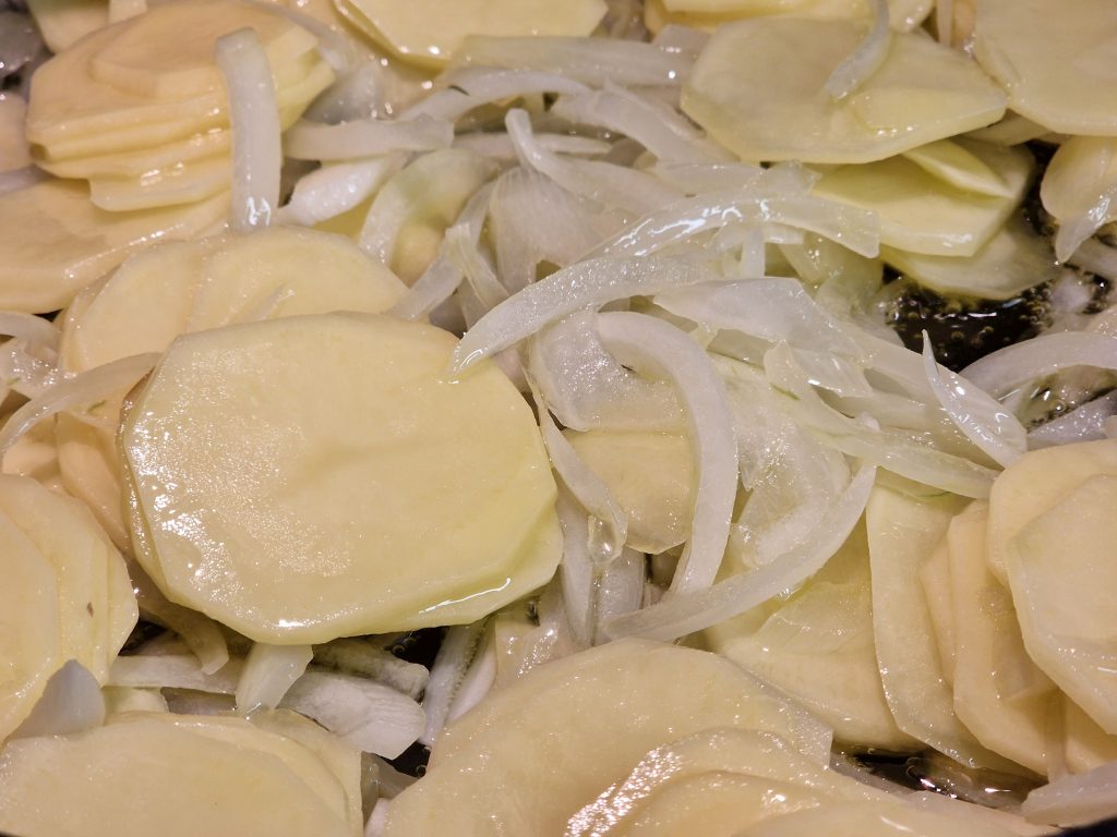 - D’Gromperen schëdden ech aaf an tuppen se mat Këchenpapeier liit drëchen, déi mëschen ech dann ënnert Ënnen an loossen alles op niddrig bis mëttel Hëtzt zéihen, datt Ganzt soll su goud wie keng Faaref aanhualen.