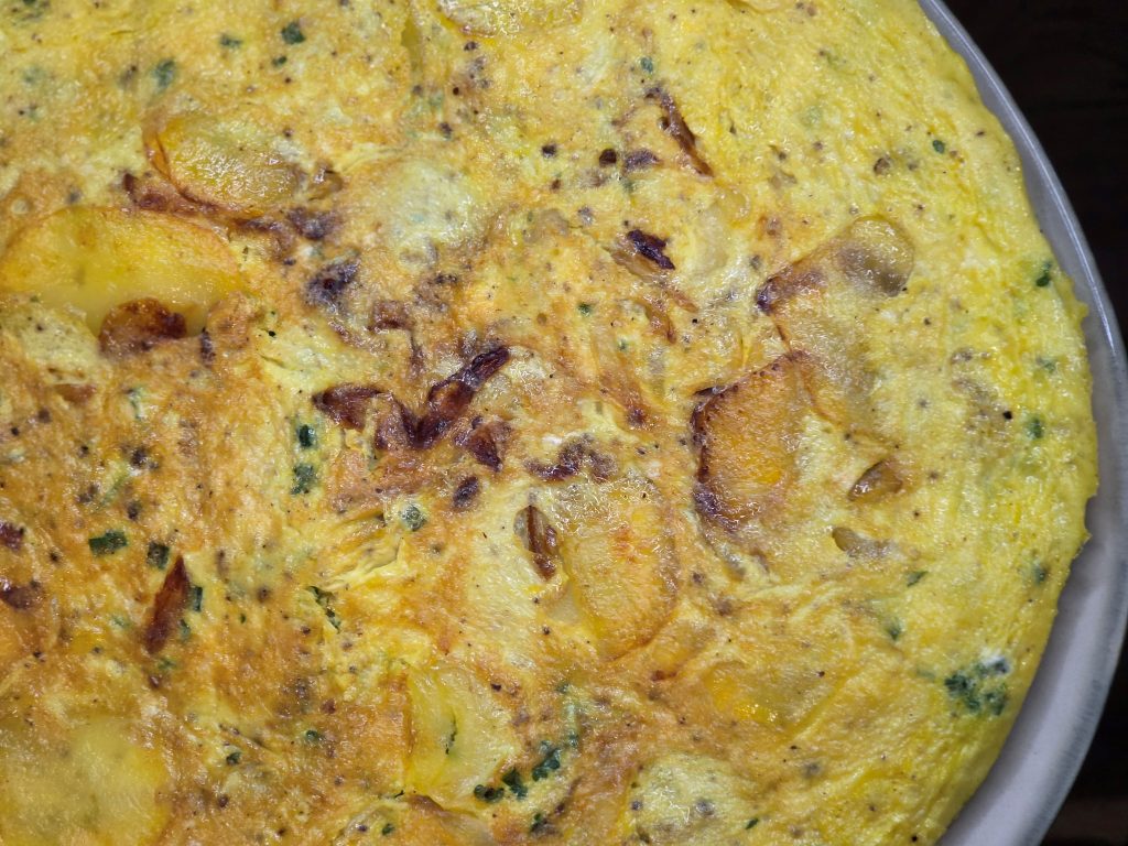 Ech breeden meng Tortilla de patata mat frëschen Zutaten zou. Keng virgekooschten Gromperen, keent Ei aus dem Pak, keen Cube. Goût entsteht hei net durich Zusatzstoffer, mee durich Zekt, Fett an Temperatur. Gromperen entweckelen Séissheet, wann een sie gemellig gart. Eier jiän crèmig, wann een sie net quält. Olivenualig drigt den Aroma, wann en net verbrennt. Datt ass keng Nostalgie, datt ass Physik an Chemie mat goudem Timing.