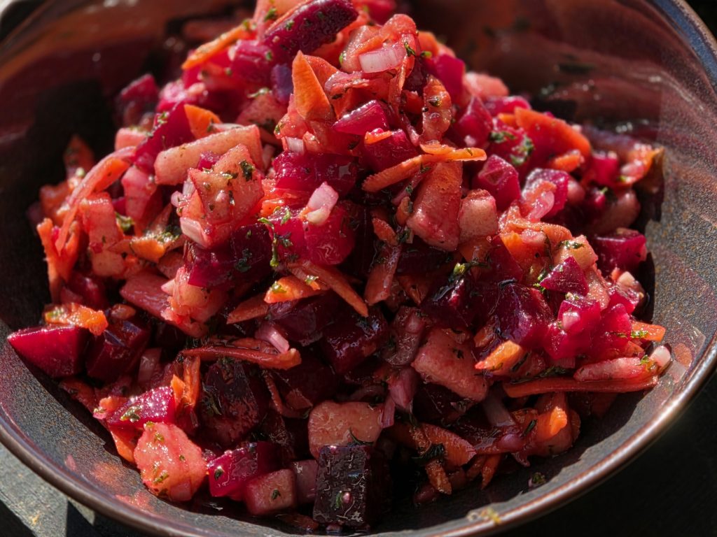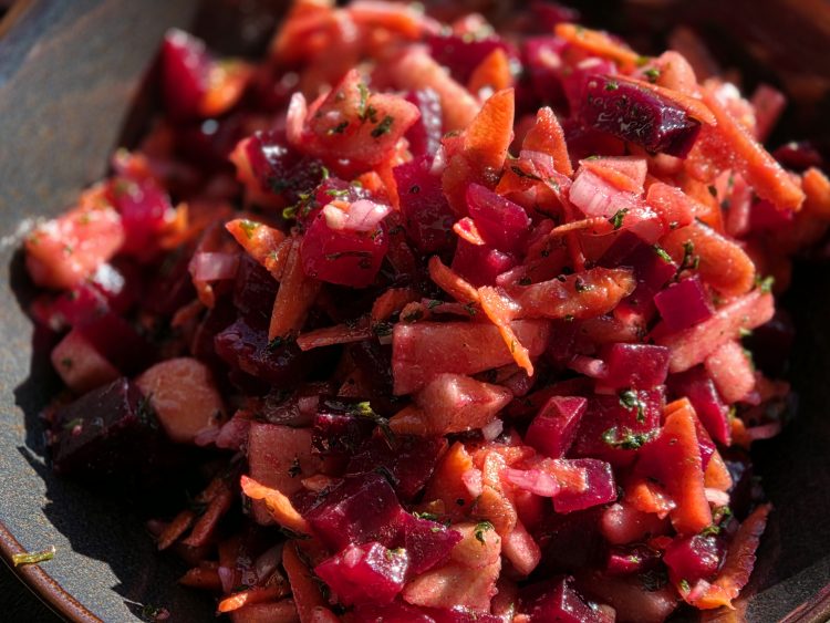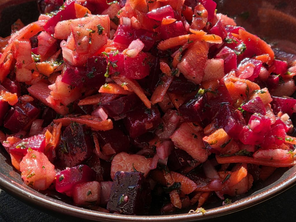 Dës Vinägrette han ech iwert meng Zaloot geschott, an während dem mëschen hat et well richtig geroosch. Een Läffel probéiert an …wow… Frësch, würzig, liit séiss durich den Appel, mam erdigen Goût van der Rommel an datt wor et, fir mech perfekt.